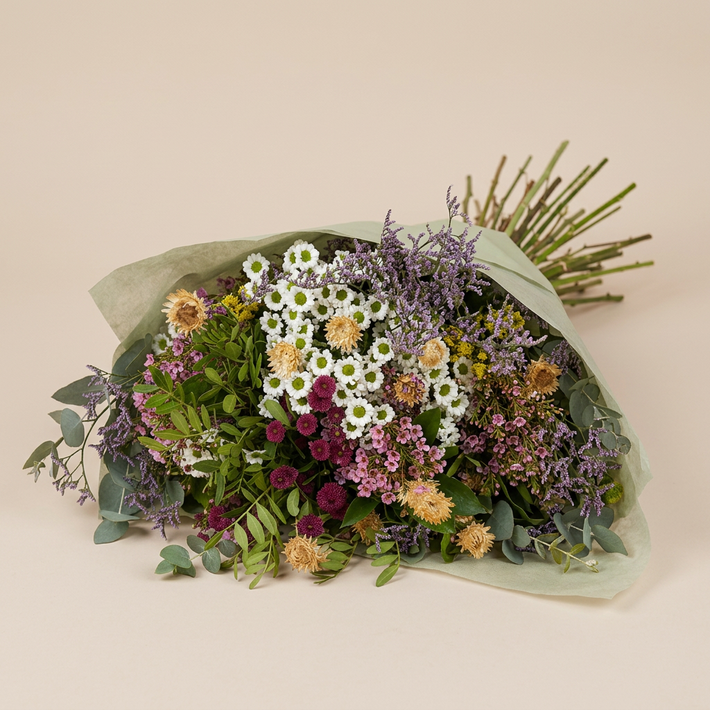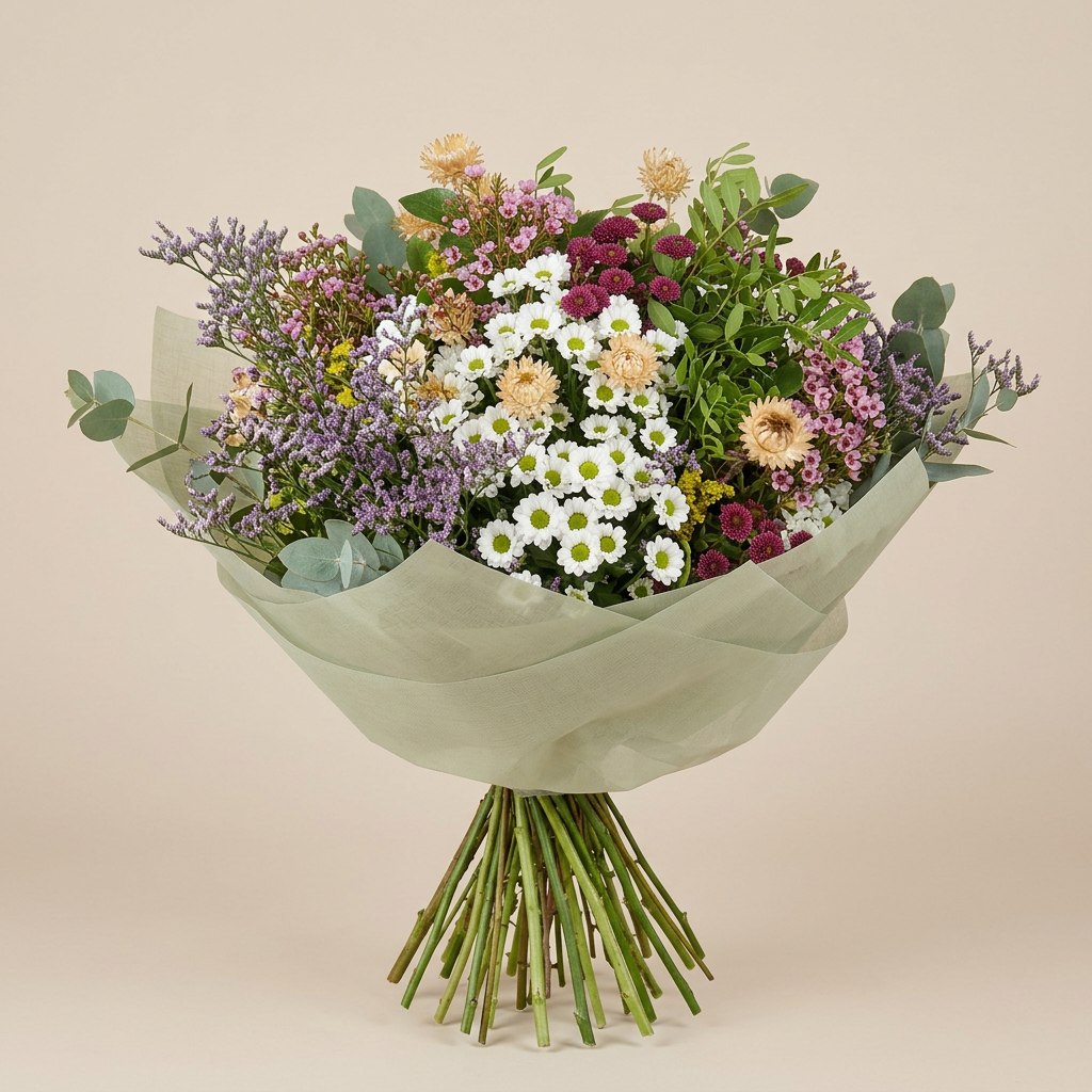En el corazón del ramo destacan las delicadas margaritas blancas que aportan frescura y luminosidad. A su alrededor se mezclan limonium en tonos lilas, pequeñas flores rosadas tipo waxflower y diminutos crisantemos en tonos burdeos que añaden profundidad y contraste. Las flores secas en tonos beige aportan un toque rústico y elegante que refuerza su carácter silvestre, mientras que los verdes naturales y el eucalipto equilibran el conjunto con frescura y ligereza.