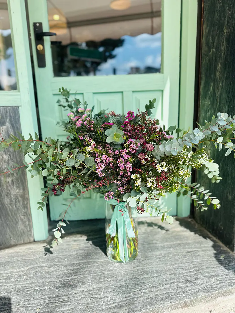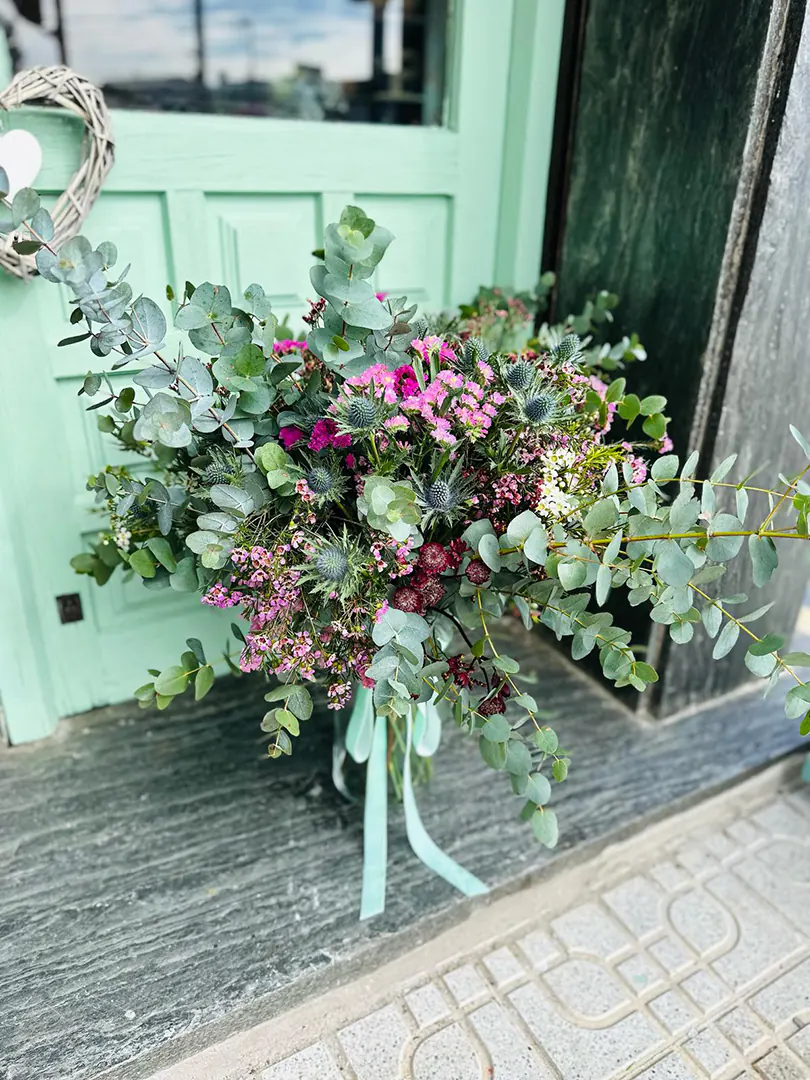 El ramo silvestre Manuela está compuesto por Eryngium, Flor de cera blanca y rosa, Limonium bicolor, nuestras maravillosas Astrantias, Statice de dos colores y Eucalipto Cinerea.
